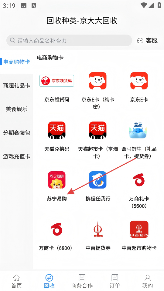 2. 在回收种类的页面当中,点击【苏宁易购】这一选项,随即进入到面值选择页面。