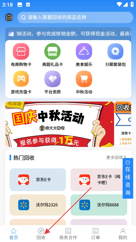 1. 打开首页后,点击底部的【回收】按钮,即可进入回收种类页面。