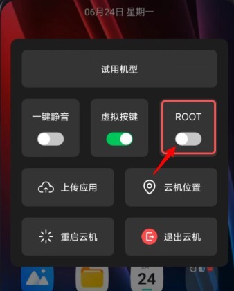 可手动开启或关闭root权限环境。进入云手机内部后,点击悬浮按钮,就能开启root权限(试用机型无法使用该功能)。