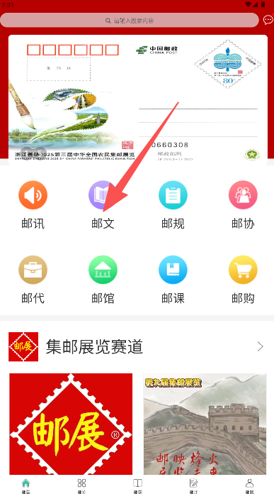 1、在首页找到并点击“邮文”。