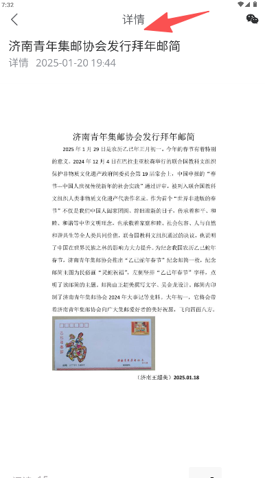 2、浏览内容时,点击标题为“济南青年集邮协会发行拜年邮简”的文章进入。
