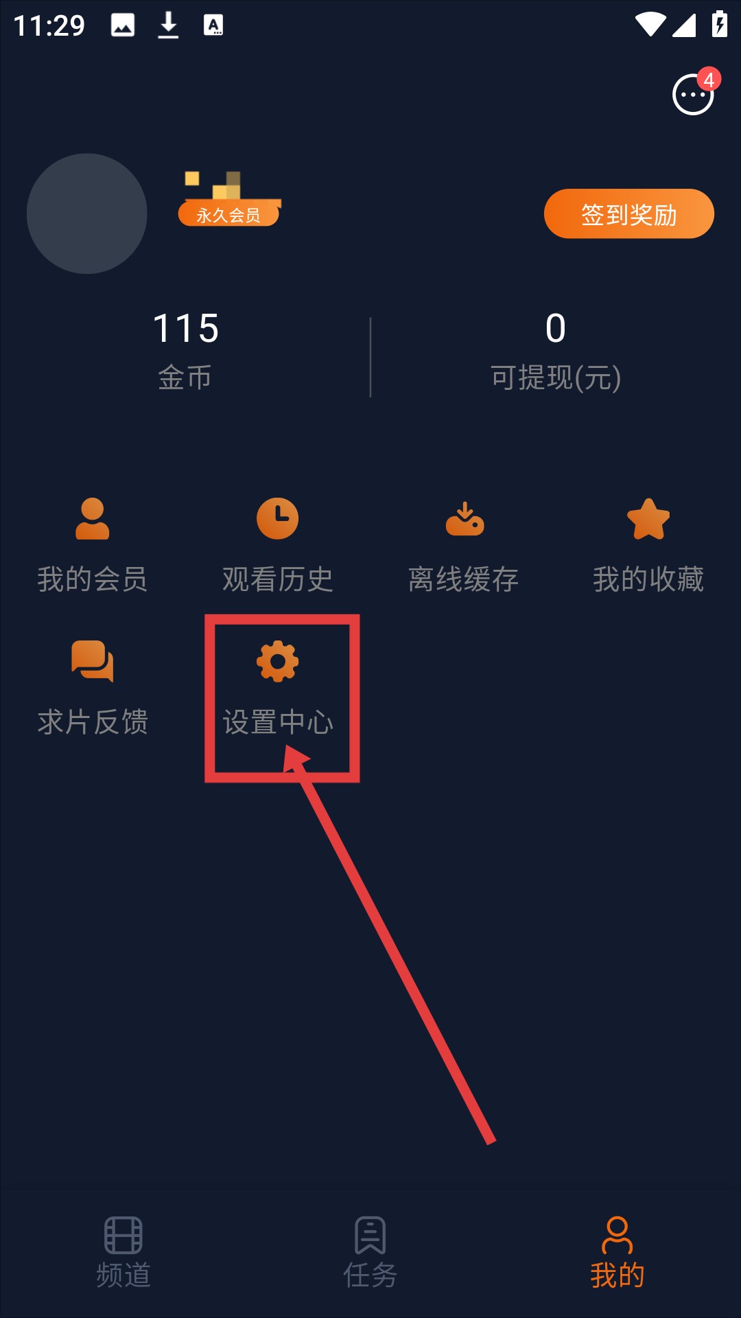 1、在个人页面,点击【设置中心】,可进入设置中心页面,准备编辑个人资料啦。