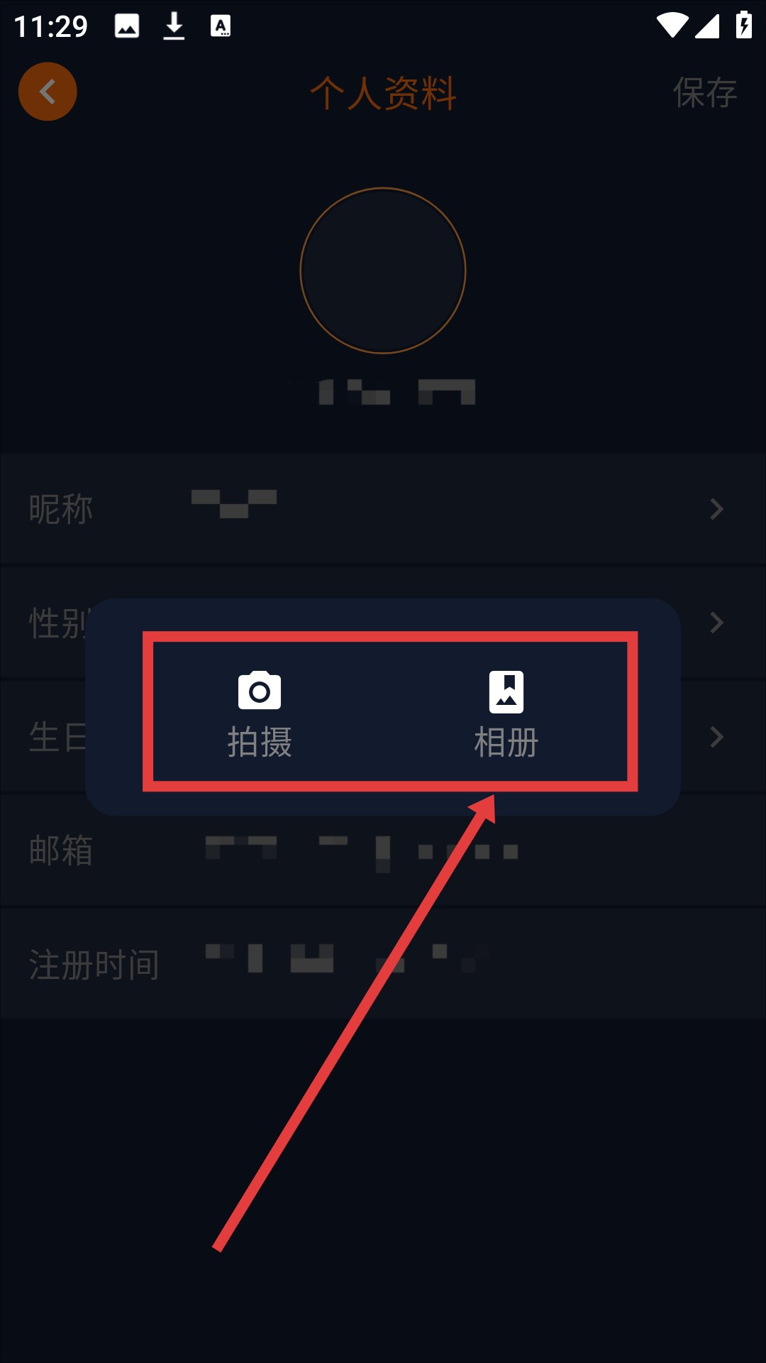 4、在弹出的选项中,选择【拍摄】或【相册】,可完成头像更换操作哦。