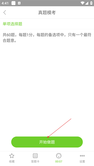 3、进入【真题模考】页面后,先确认题型说明,再点击【开始做题】按钮,即可开启真题作答流程。