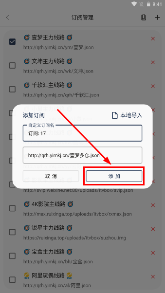 4、点击+号后会弹出添加订阅的窗口,接着直接点击添加按钮,之后就可以选择线路,返回首页观看电视了。
