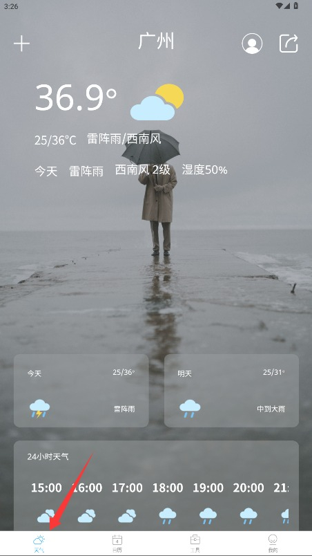 3、天气主页支持直观查看当前温度、湿度、风速等实时数据,以及未来24小时的天气预报。