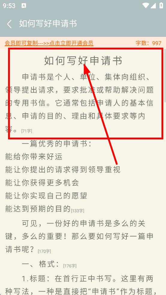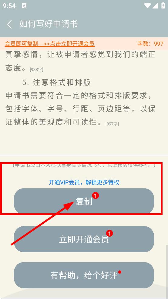 3、在“如何写好申请书”页面的底部,若您已开通VIP会员,可点击复制按钮复制相关内容;若未开通,也可选择立即开通会员或给好评。
