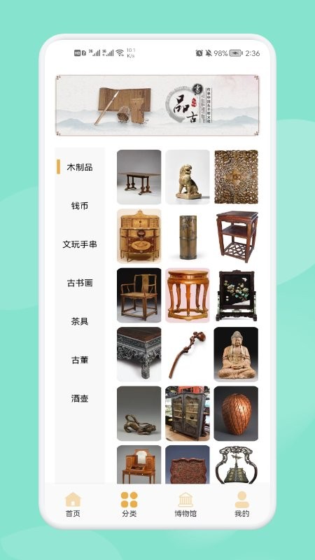 2、打开软件进入首页,通过直观的分类导航界面,点击感兴趣的古董类别进入详情页面。