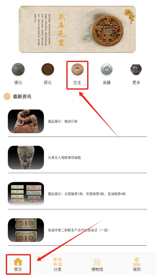 1、打开古董大全软件,在首页众多选项里,找到并点击 “古玉” 板块。