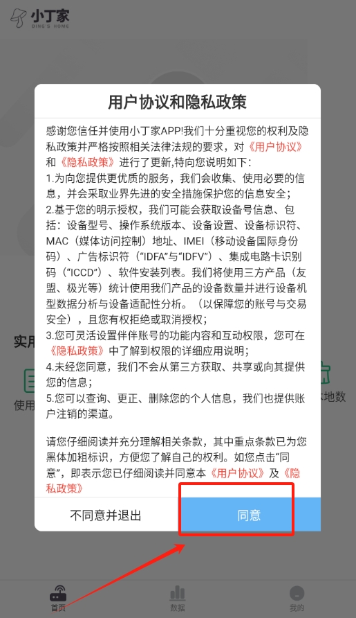 1、打开小丁家软件,映入眼帘的是软件协议界面,点击 “同意” 按钮,开启软件使用之旅。