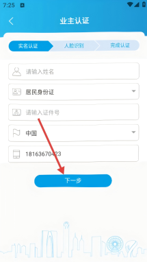 4填写姓名与证件号等相关信息后,点击“下一步”按钮,以推动业主认证的审核流程向前进展。