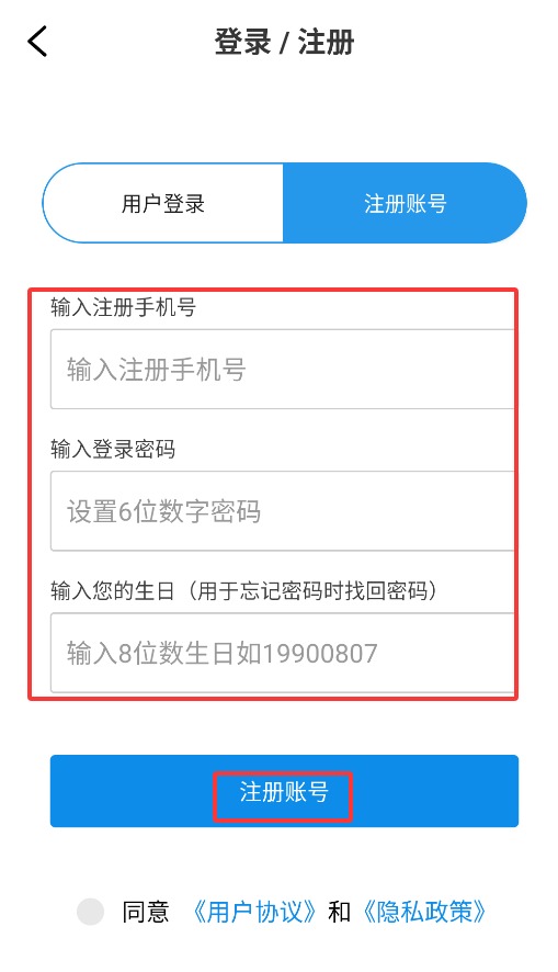 3、注册时需要输入手机号码,设置6位数字的密码,同时填写生日信息,该信息将用于密码找回。