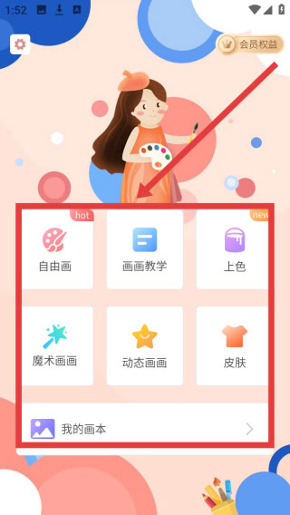 3、界面以亲切的卡通画家形象为引导,功能分区明确直观。设有自由创作、教学课程等多种模式,包含填色游戏、特效绘画等趣味玩法,并配备个人画册管理作品集。