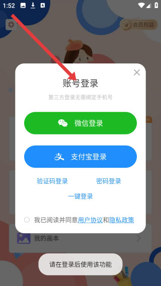 2、提供多种账号登录方式,支持第三方平台快捷登录及手机验证码登录。同意服务协议后即可完成账号绑定,便于个人作品的云端存储与进度同步。