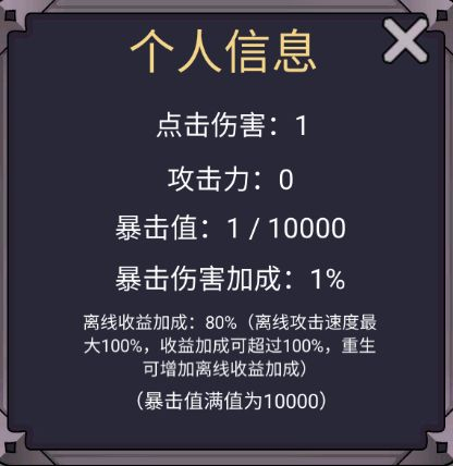 可以看到点击伤害、攻击力、暴击值、暴击伤害、离线收益加成等等信息,偶尔可以看下。