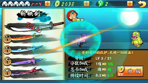 火焰剑:召唤火焰围绕在忍者的身边,自动攻击前方敌人。