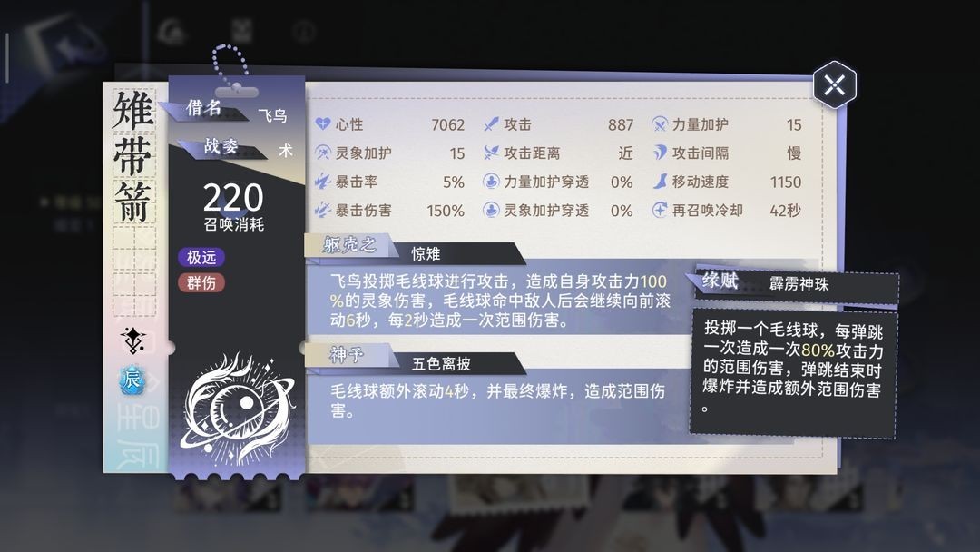 如上图所示,这是0羽化且好感度加成10%的雉带箭。若扣除好感度加成,0羽化的雉带箭攻击力为806 ,而5羽化的雉带箭攻击力为1008(羽化存在25%的加成)。其费用是198,群体倍率为100%。经测试,毛球的第一下是单体伤害(在此忽略不计),之后会缓缓向前弹射,造成范围伤害。毛球弹射的过程持续12秒,总共造成5次群体伤害,由此可得攻速约为2.4秒/次。 依旧进行60秒无间断输出测试,60秒内共扔出5次毛球,造成25次群体伤害,总伤害为25200。换算为花费相同费用情况下的输出为:250÷198×25200 = 31818 。总结:
