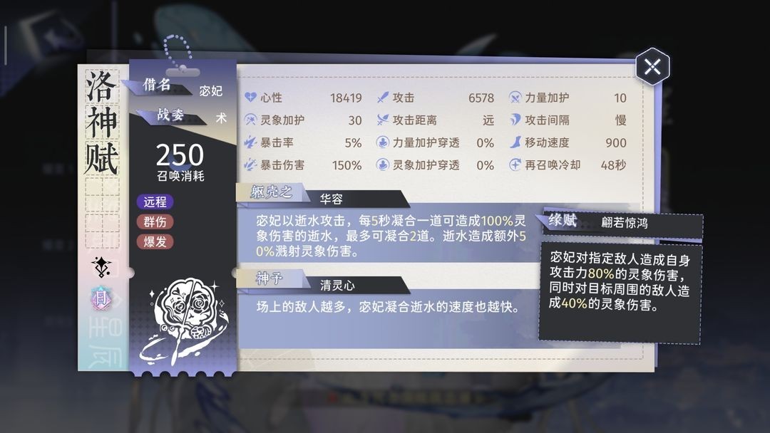 洛神赋的面板数值颇高,然而其攻击速度实在迟缓,致使角色常常处于罚站状态,常常还没来得及出手攻击,目标就已死亡,这使得大量伤害白白流失,并且在攻击残血敌人时,也会浪费不少伤害。再考虑到250的费用,这让洛神赋使用起来难度颇大。蝶左增强了群体攻击伤害,蝶右略微提升了攻击速度,可即便如此,4秒多才攻击一下,依旧显得缓慢。