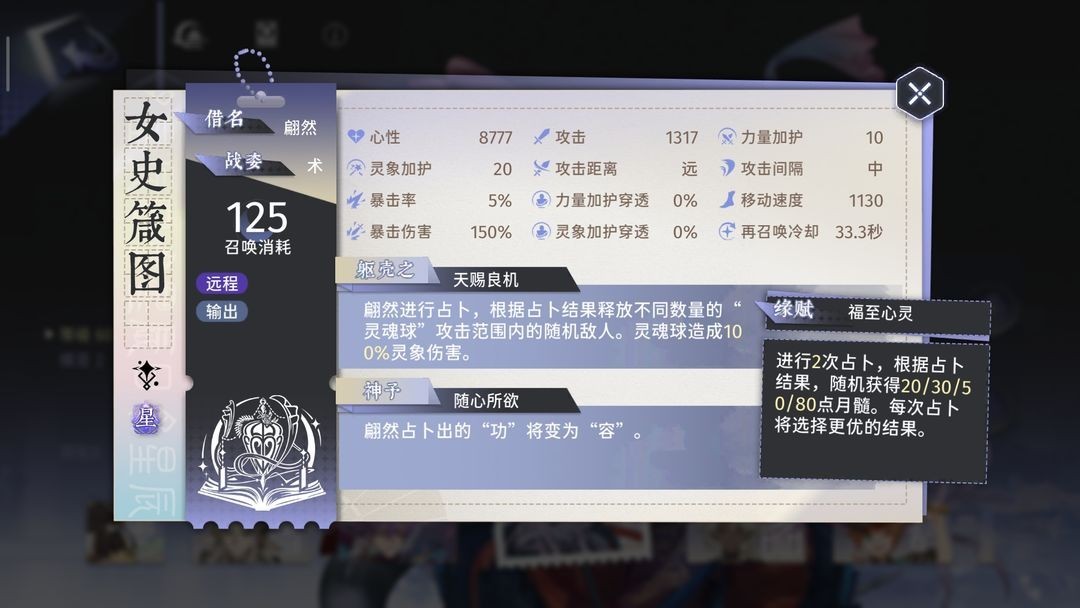 《女史箴图》,费用125,羽化值0,白板攻击1098(图中显示1317是由于亲密度增加了20%),攻击速度为5秒/次。其倍率设定颇为有趣,《女史箴图》会进行2次占卜,每次占卜结果在2、2、3、5之中,随后会选取最高值,并打出相同数量的球球展开攻击。举例来说,若最高值为5,此次普通攻击就会发射5个球球,每个球球造成100%攻击力的伤害,即此次普攻倍率为500% 。经过简单计算,每次打出球球数量的数学期望为3.5,这意味着《女史箴图》普攻平均倍率为350% 。假设《女史箴图》60秒不间断输出,那么可普攻12次,60秒总输出为46616 。但需注意,《女史箴图》仅需125费用,2个《女史箴图》的费用等同于1个《洛神赋》。如此一来,2个《女史箴图》60秒的输出高达92232!!总结: