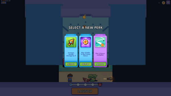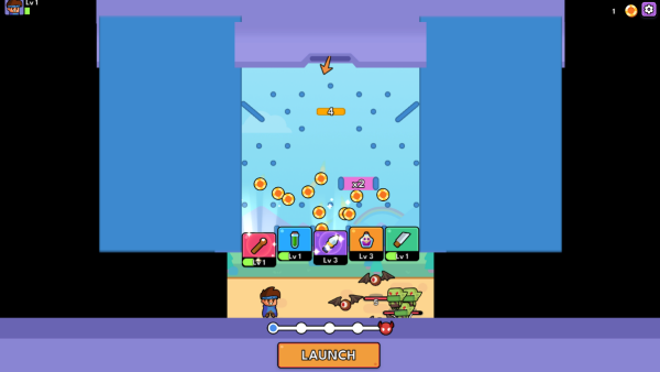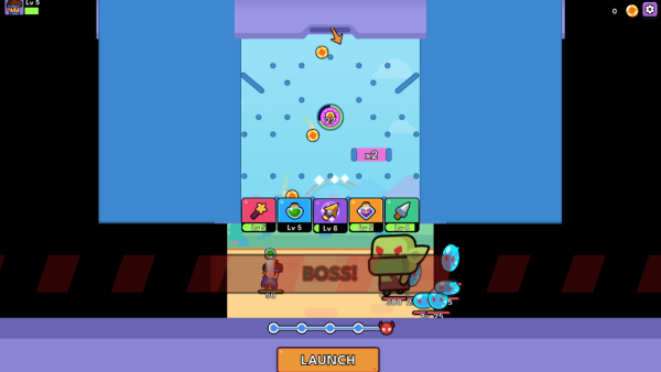 2.如下图,点击屏幕下方的“launch”可以消耗金币,金币将从上而下掉落,随机激活各种武器。
