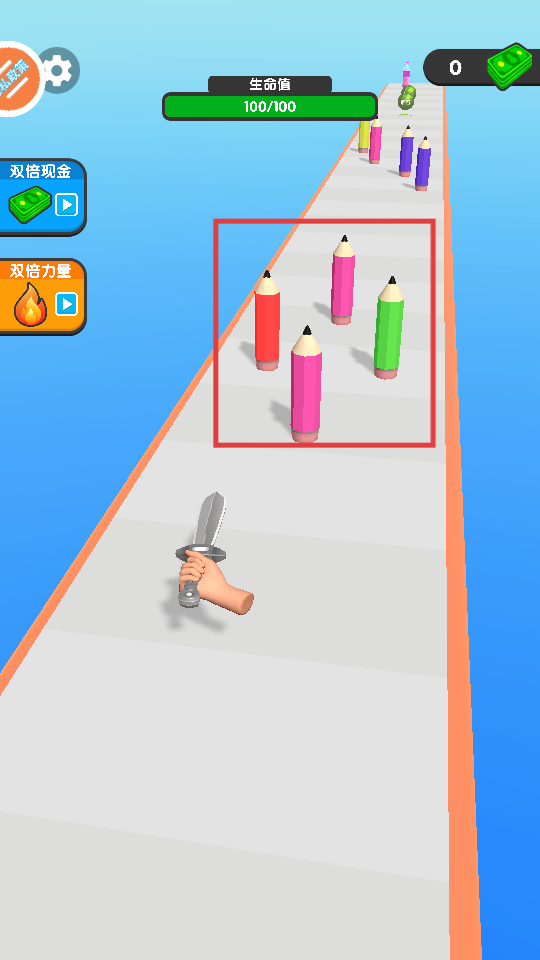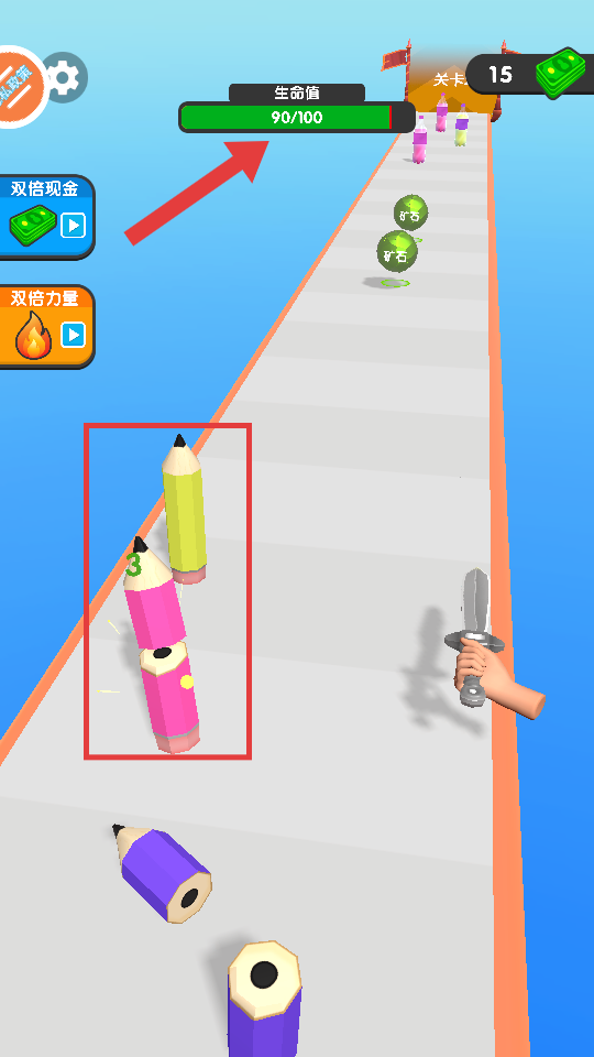 2、游戏开启后,控制角色前行,留意躲避赛道上形如【彩色铅笔】的障碍物,以防生命值受损。