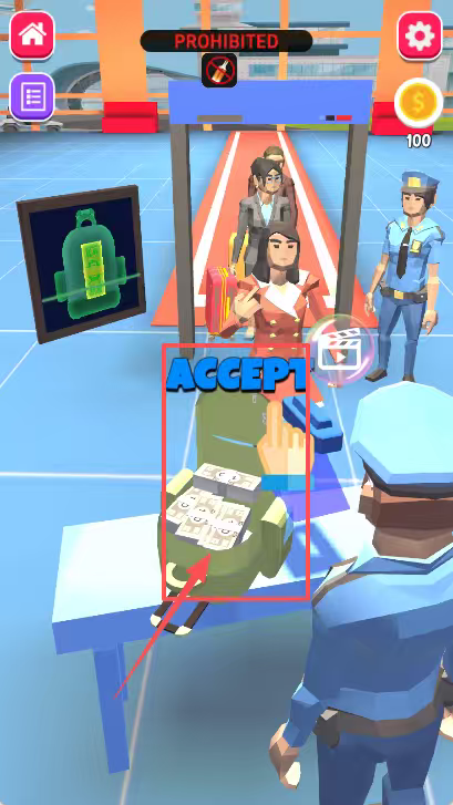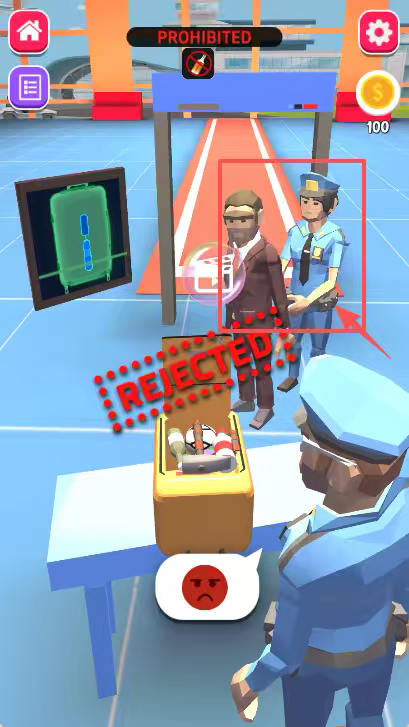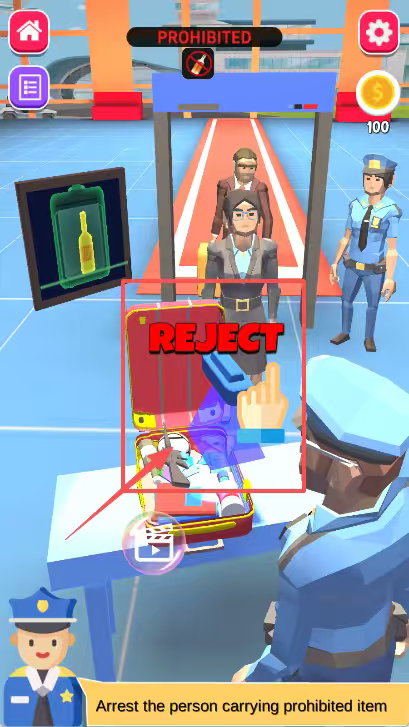 3、上方出现了违禁标识,中间身着西装的男子面前的行李箱被查出存在问题,屏幕上显示“拒绝”字样。右侧警察旁边的金币显示为100,按照提示,逮捕携带违禁物品的人即可。