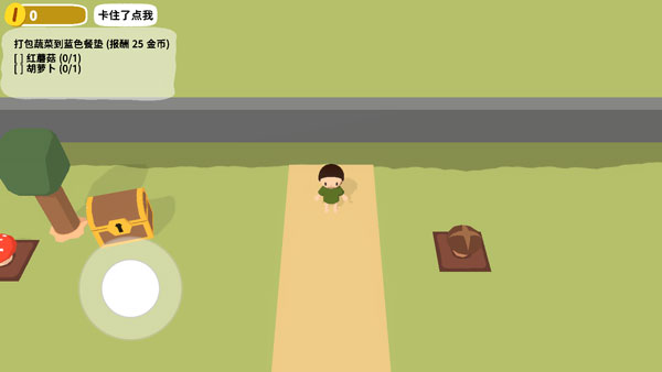 1、打开黏脚菜园手机版,进入游戏如图,玩家首先需要根据左上方任务提示,拾取一个红蘑菇到蓝色桌垫上;