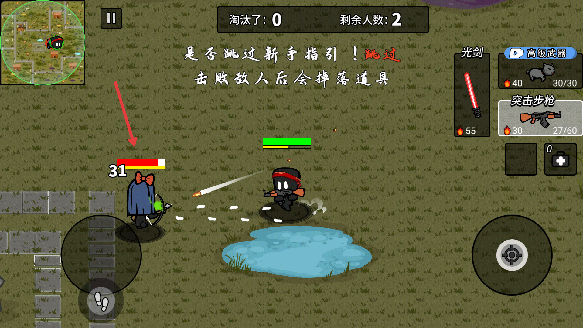 2、发现装备或武器时点击即可捡起获取;按住右侧按钮可进行连发攻击敌人;掉落的道具靠近后会自动拾取,以此补充资源。