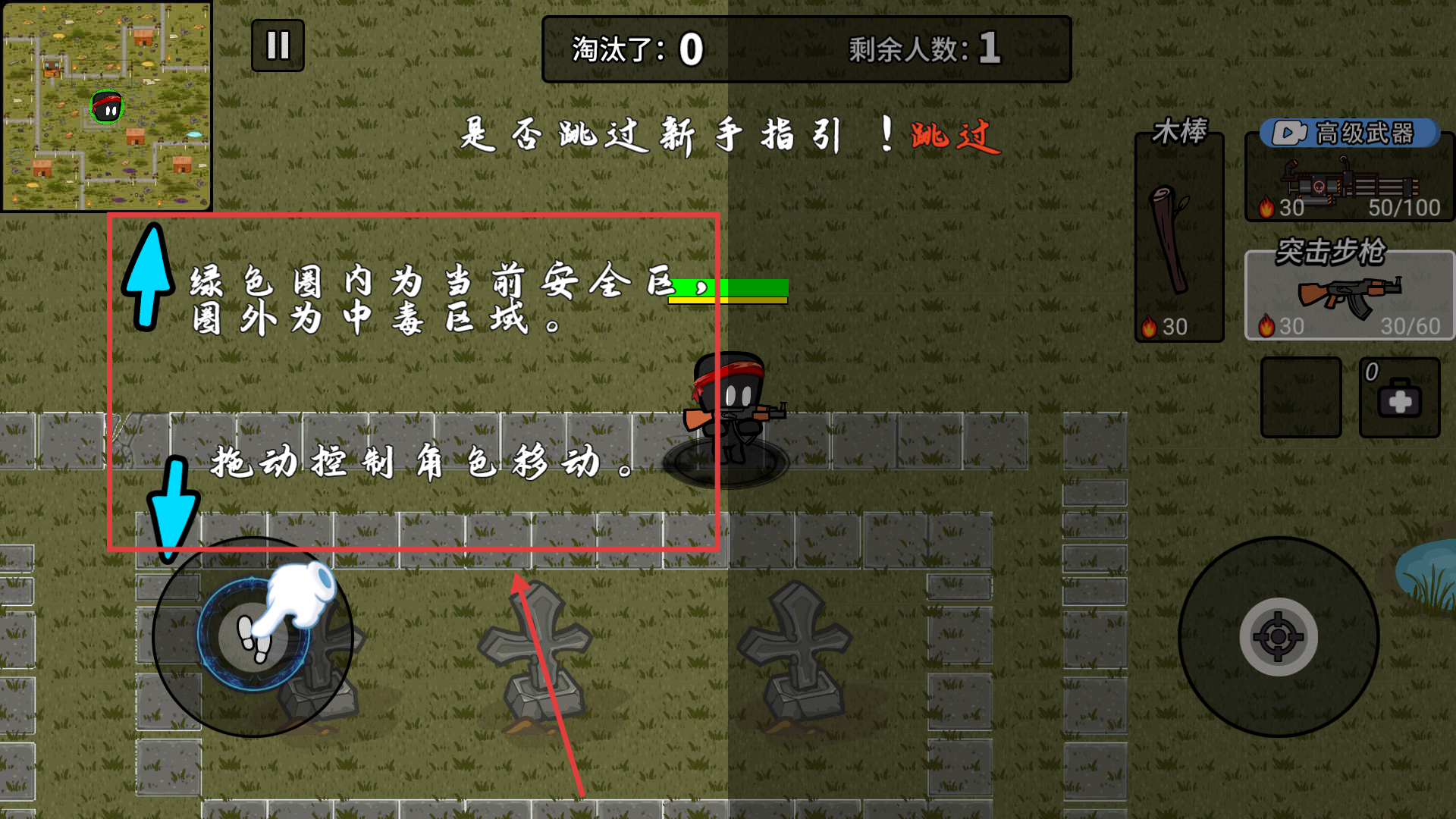 2操控角色移动时,要确保处于带有绿色标识的安全区域内,远离区域外的中毒地带,可借助左侧的摇杆来灵活调整自身所处的位置。