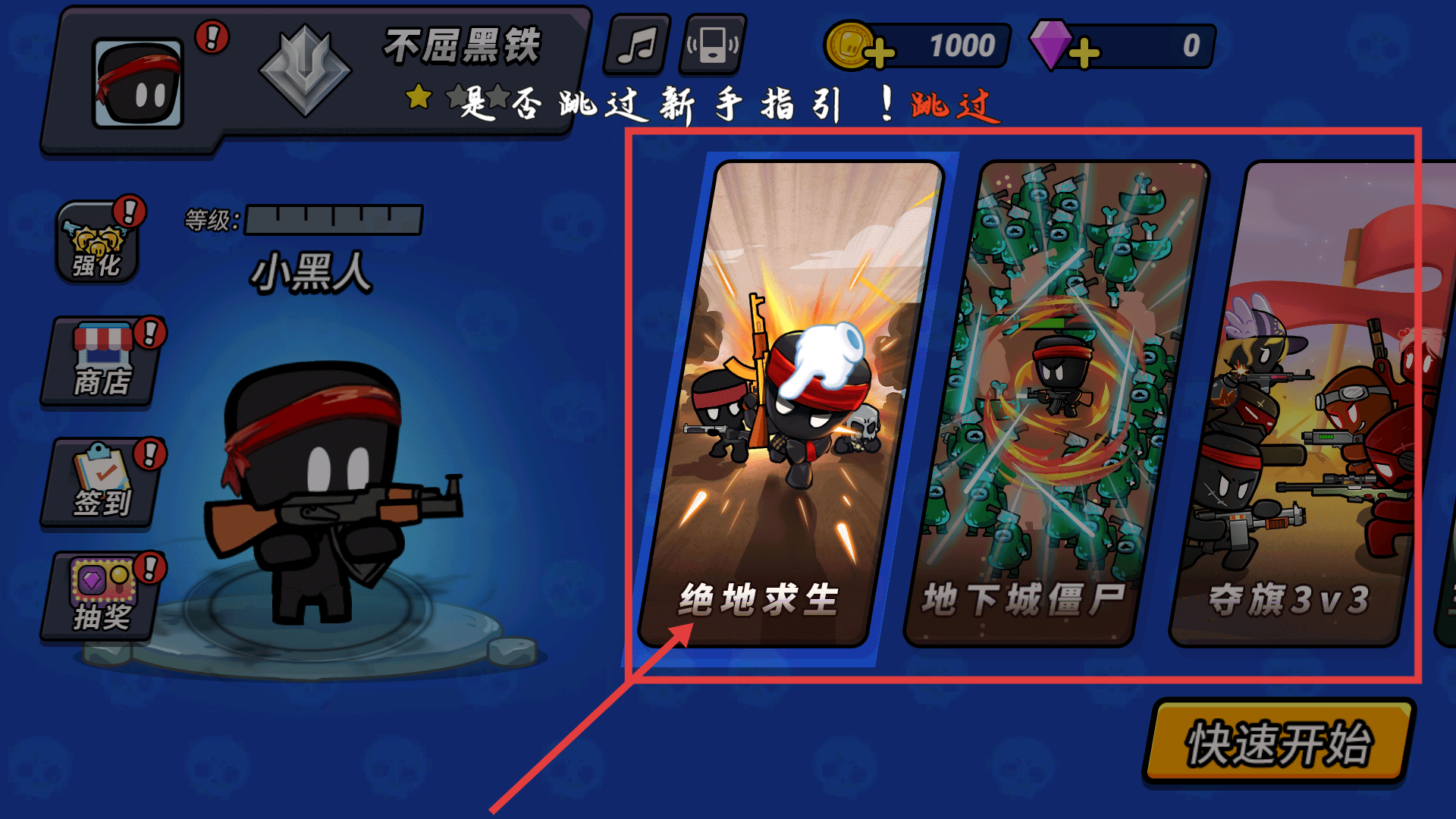 1进入游戏后,选择【绝地求生】-【地下城僵尸】-【夺旗3v3】模式,借助【强化】-【商店】-【签到】功能增强自身实力。