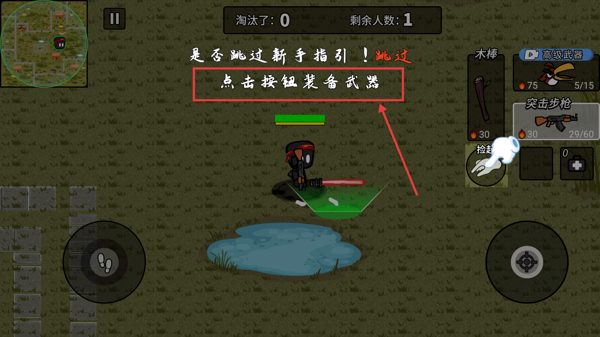 3、当发现武器时,点击【捡起】按钮即可完成装备;装备后可在【木棒】与【突击步枪】之间切换,以此增强战斗能力,从而更有效地击败敌人。