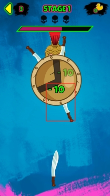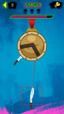 1在游戏里的特定画面中,找到合适的机会点击下方的刀具,让它朝着戴头盔持盾牌的对象飞去,努力击中对方来产生伤害效果。