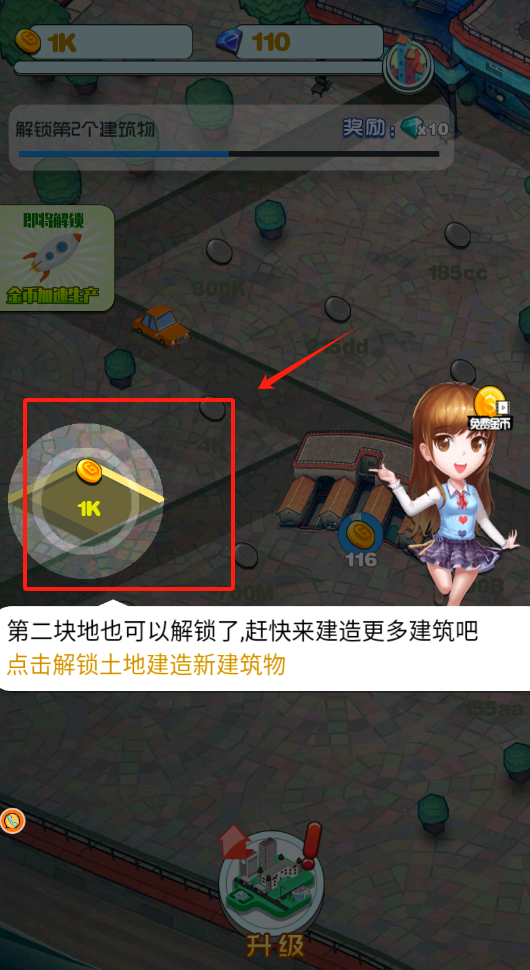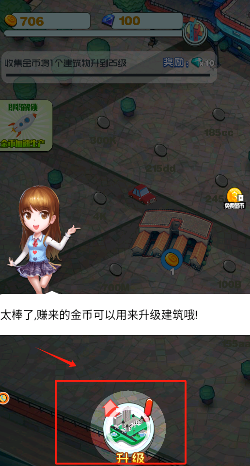 1、点击中间的建筑收取金币,将其升级至25级可获得奖励,左下角的女孩会提示如何加速生产。