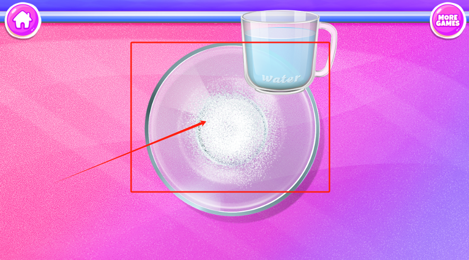 3、按照红色箭头的指引,将右侧杯子里的水倒入左侧的碗中,与白色粉末进行混合。