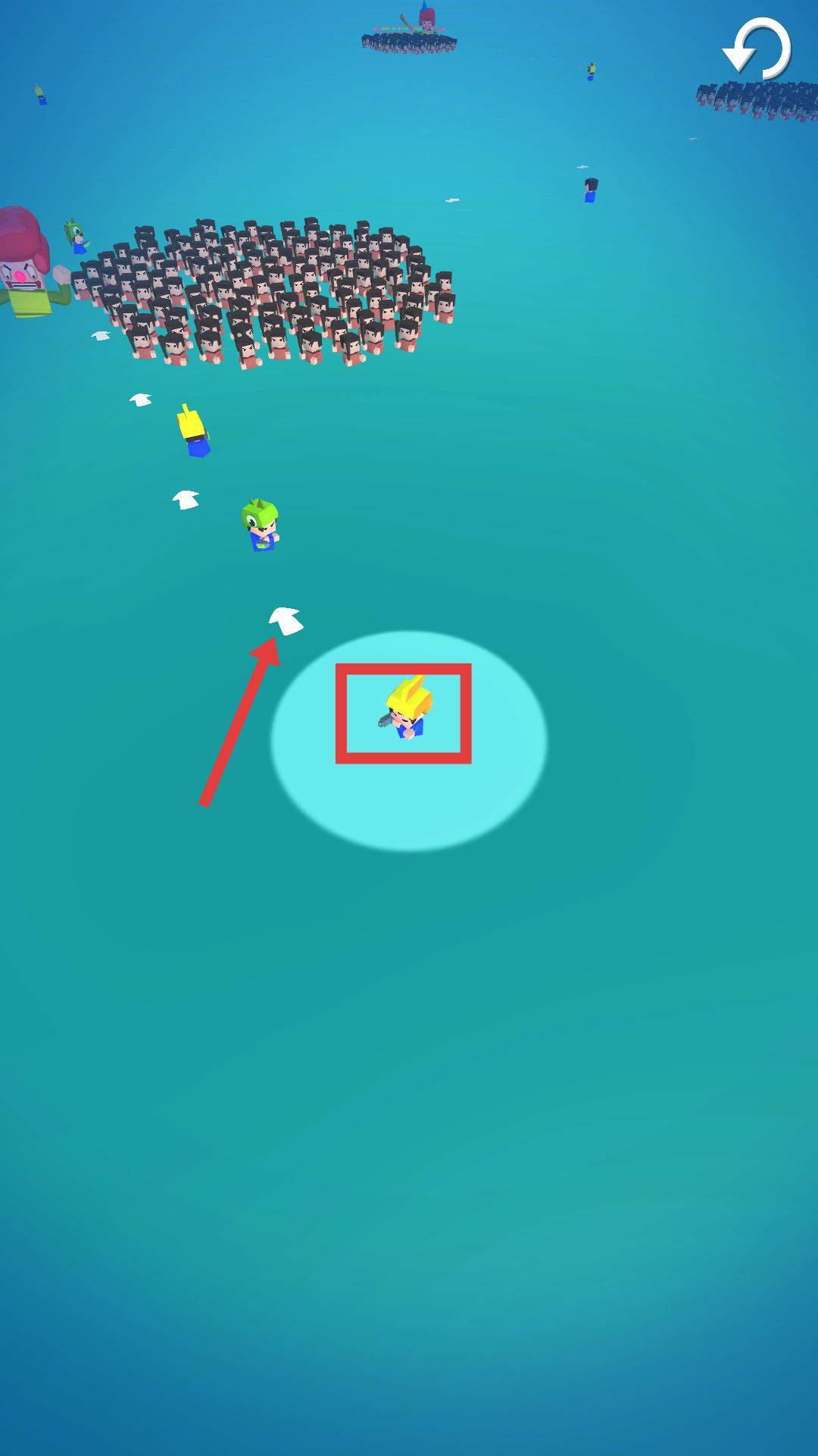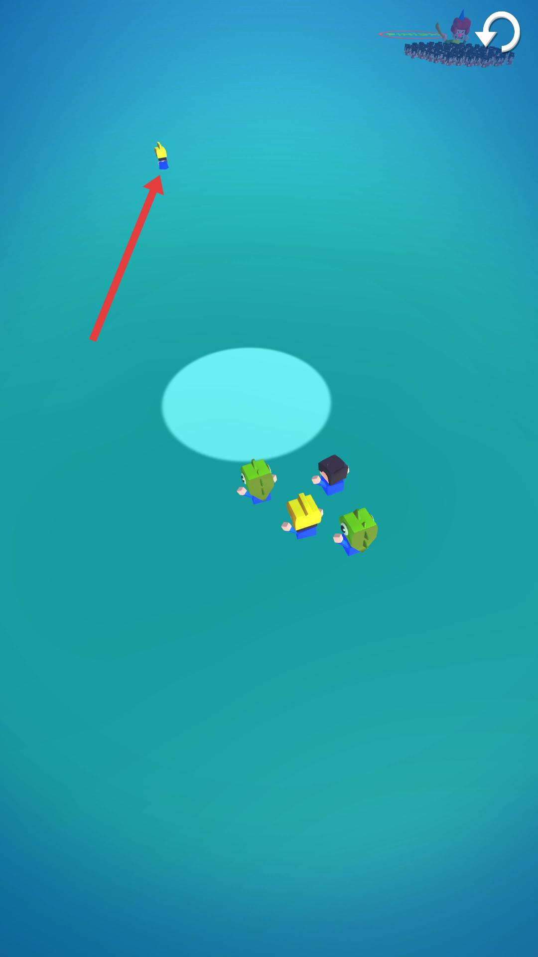 1、控制黄头盔角色,顺着箭头指示的方向行进,逐步靠近小绿人队伍,通过合并来增强自身力量,在此过程中要留意避开敌方的大规模人群,以保存现有实力。