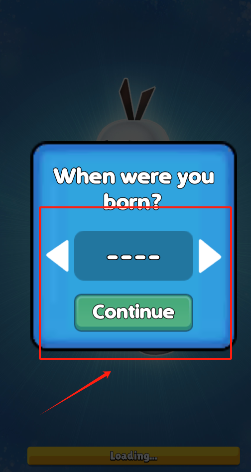 1、通过左右滑动选择生日日期,点击虚线输入框完成填写后,再点击继续按钮即可进入游戏。