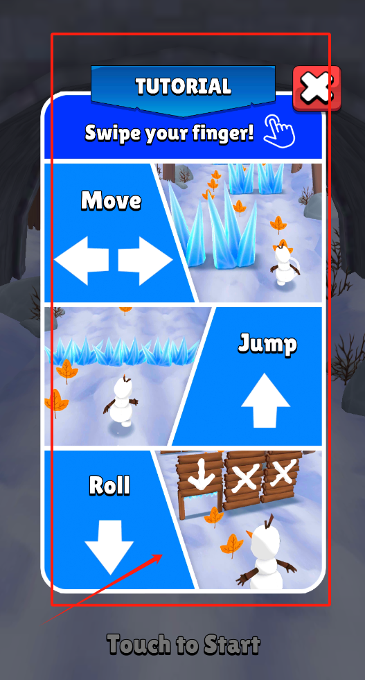3、通过手指在屏幕上进行上下左右的滑动操作,来控制雪人完成移动、跳跃和翻滚动作,教程观看完毕后点击叉号将其关闭。