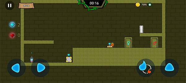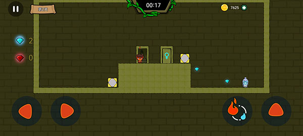 3、游戏里设置了多种道具供玩家使用。就像这块石头,玩家得操控火娃娃把它推下去,如此一来,冰娃娃就能轻松跳上来。