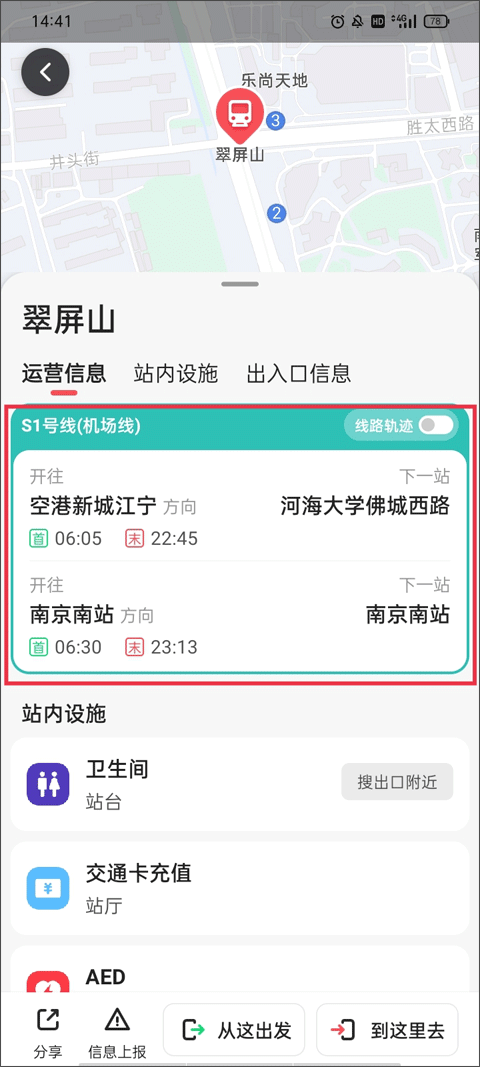 3、当你选好起点与终点,便能看到其运营信息、站内设施以及出入口信息,内容极为详尽。
