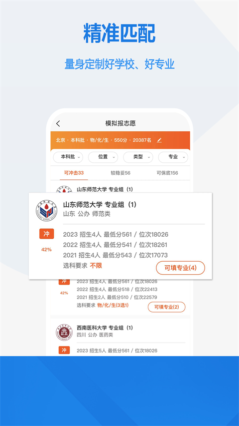 1、用户使用本软件将能够根据其喜好精准的进行学校和专业的匹配;