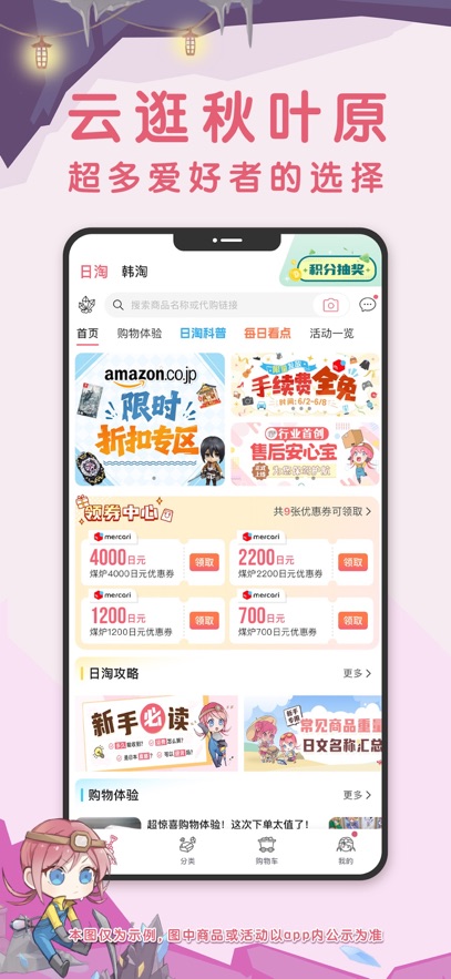 平台覆盖煤炉、乐天、Rakuma、Bookoff等日本知名商城,商品种类丰富,包括动漫周边、模玩手办、韩娱小卡、掌机游戏等。