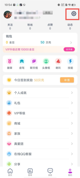 首先,进入软件的个人页面,然后点击页面右上角的设置图标。
