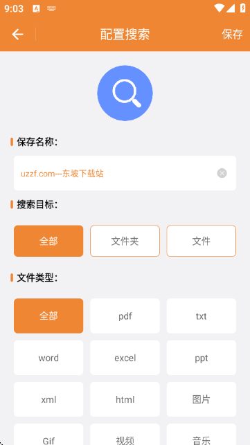4、接着点击右上角的【+】,便能添加搜索配置,如图片所示。在此过程中,可设置配置名称、搜索目标以及文件类型,最后点击右上角的【保存】,即完成操作。