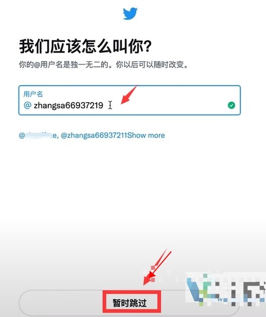 7、此处为我们的用户名,推特会默认向我们提供几组账号以供挑选,要是我们不喜欢,能够改成自己心仪的用户名。