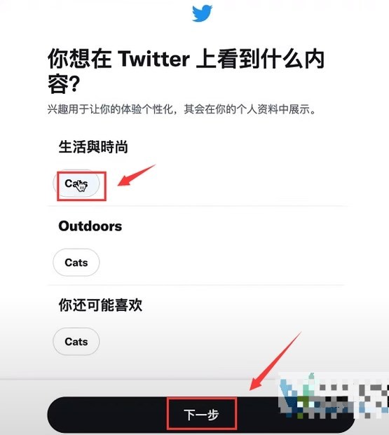 8、在此处,你能够依据自身喜好,挑选希望在推特上看到的内容。完成挑选后,点击“下一步”。