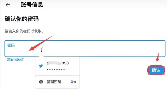 13、出于账号安全考虑,推特要求我们再次输入账号密码。输入完成后,点击“确认”。