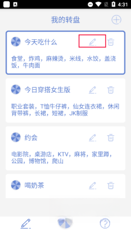 2、由于预设模板的限制,你大可以自定义设置。以“今天吃什么”为例,点击编辑,通过键入美食选项来进行自定义。