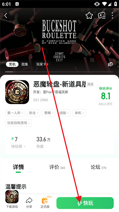 4、最后,在详情页的最底部点击【快玩】,如此无需其他操作即可体验游戏。