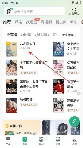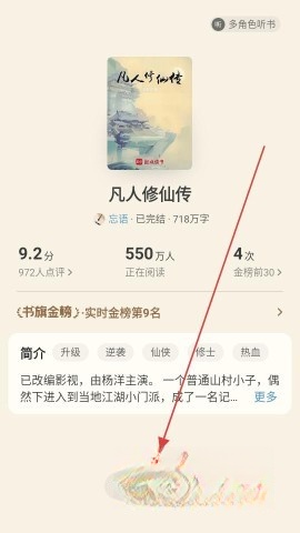 1. 打开书旗应用,进入书城界面,于推荐榜单里寻得《修仙传》这本书,轻点其封面,即可进入详情页面,查看诸如评分、字数之类的信息。