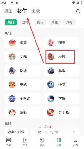 2. 在女生分类页面,浏览热门标签,寻觅到校园标签并点击,从而进入校园类书籍筛选页面。